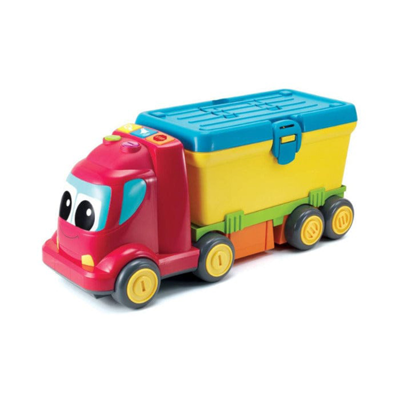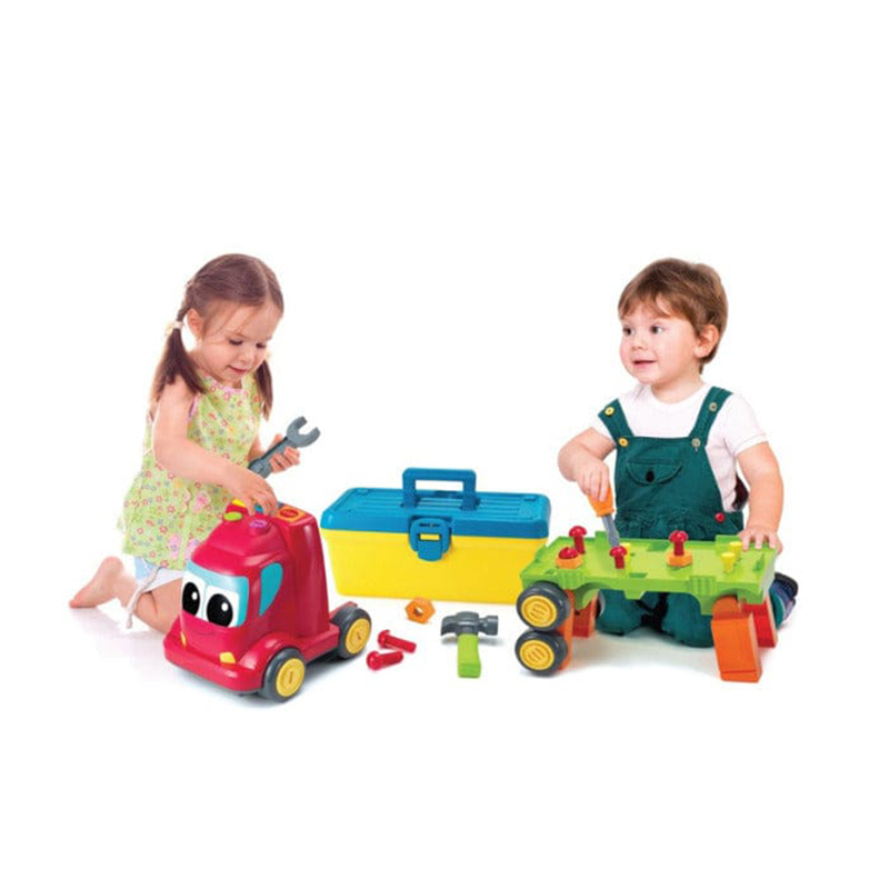 Kamioni i madh lodër transformohet në një tavolinë pune ose në një kamion lodër të rregullt dhe vjen me mjete lodër si çelësa, kacavidë, çekiçë, dhe bulona.