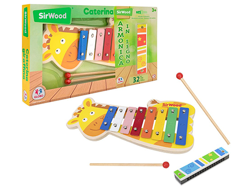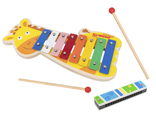 Përfshirë është një ksilofon i lezetshëm në formën e një gjirafe të vogël dhe një harmonikë prej druri dhuratë.