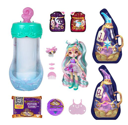 Përzieni përbërësit magjikë në shishe për të bërë një ilaç vezullues, thoni fjalët magjike dhe zbuloni një kukull të bukur Deluxe Pixling dhe shoqen e saj Mini Mixie!