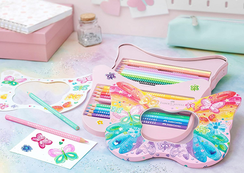 Kuti metali në formë fluture që përmban 12 lapsa me ngjyra shkëlqyese në ngjyra standarde shkëlqyese dhe 8 ngjyra pastel.