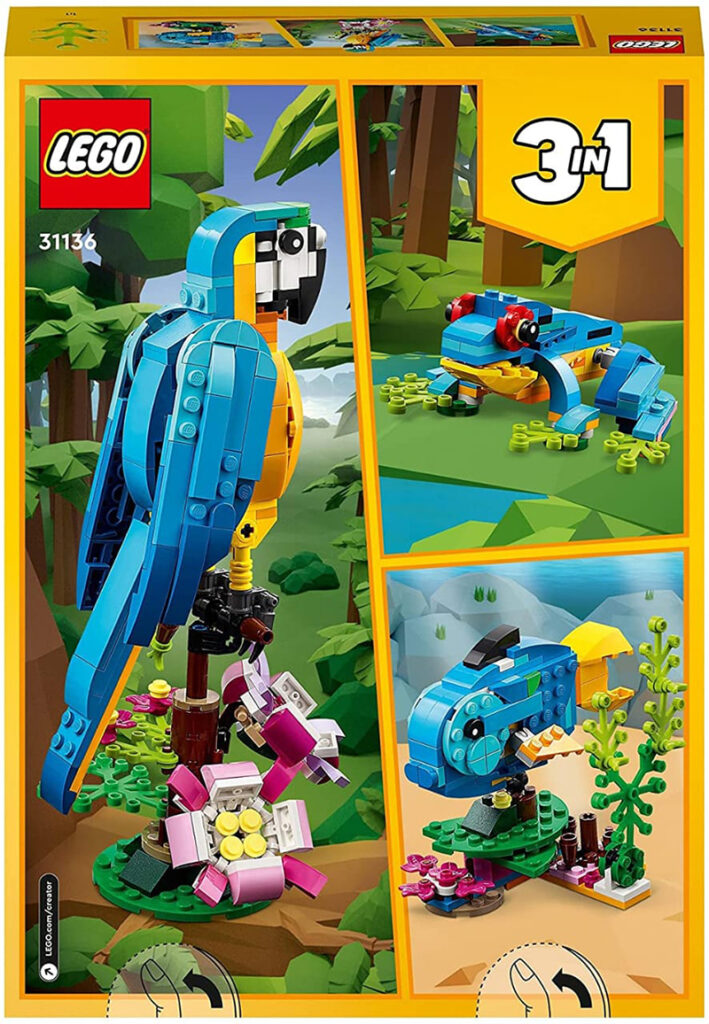 With this incredible LEGO Creator 3-in-1 exotic parrot (31136) building toy, children can explore the rainforest. This playset contains three exotic animals – a parrot, a fish and a frog – all of which feature amazingly articulated body parts that children are sure to love. The parrot is colourful and has joints that allow it to turn his body on the branch and move his wings and tail. It can also be transformed into two other animals – into a frog or a fish! Children aged 7 and up will be amazed by the 253 pieces of this set, with which they can build their own little rainforest wonderland. To bring this toy to life, you only need a lively imagination. And when the playtime is over, this building toy is a great display piece, because it is decorated with many small details, such as the flowers that decorate the branches of the parrots. And with the intuitive instructions in the LEGO Builder app, children have even more creative ways to develop their skills. This LEGO Creator 3-in-1 animal playset is the perfect way to promote creativity while learning the basics of building. With three different stories, children can experience an exciting journey into the wilderness with their animal friends! Don’t forget to look at the other exciting sets in the series such as Spaceshuttle (31134), beach camping bus (31138) and cosy house (31139). Let the adventures begin! The parrot toy is approx. 22 cm high, 11 cm long and 12 cm wide. Contains 253 pieces.