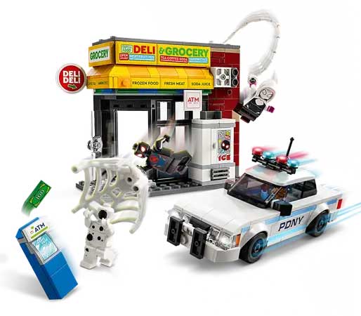 Seti i lojërave Spider-Man vjen me 4 minifigura: Miles Morales, The Spot, Gwen Stacy dhe Oficeri Jefferson. Dyqani ka një veçori të murit shpërthyes që lejon heqjen e ATM-së. Aksesorët përfshijnë një litar të gjatë e fleksibël rrjeti dhe një rrjet fleksibël që është mjaft i madh për të mbyllur një minifigurë. Makina e policisë hapet për të lejuar vendosjen e 2 minifigurave brenda.