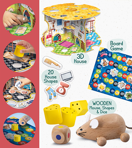 Shtëpia e miut 3D – Forma druri – Miu prej druri – Zare prej druri – Siluetë kartoni – Lojë me numra – Tabela e lojës