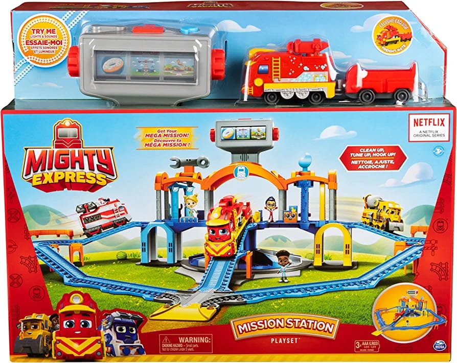 Get ready for the ultimate Mega Missions with the Mighty Express Mission Station Playset! This set brings the world of Mighty Express and iconic moments from the show to life! Discover all of the set’s exciting features, including train wash and tune up stations, a flipping Busy Board, spinning cargo car selector and lights and sounds! Play out your action-packed missions right out of the box, with an exclusive Freight Nate push along train, cargo car and a Max collectible figure. Spin the dial on the Busy Board for your Mega Mission, then send Nate through the train wash and tune up stations. Spin the cargo car selector, connect Nate’s car, and lift the red lever to launch Nate into adventure! Deliver carloads of fun with the Mighty Express Mission Station Playset