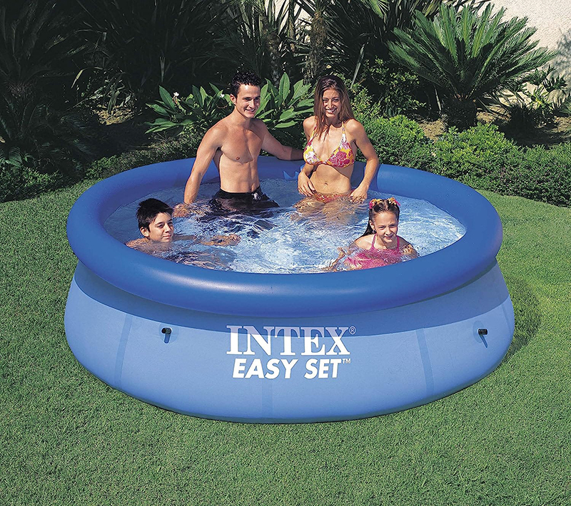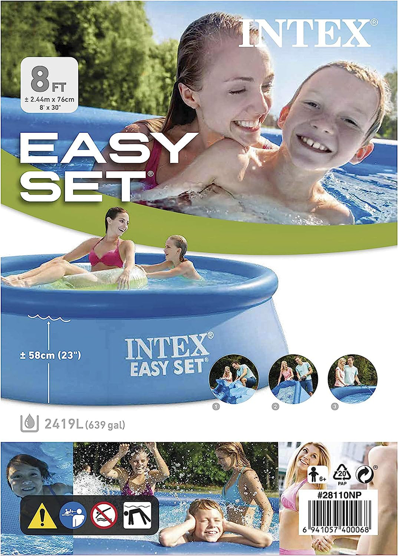Intex’s beautiful Easy Set Pools will ensure that you enjoy seasons of garden family fun! Intex have brought years of enjoyment to millions of people around the world. Their high quality, easy to assemble pools are the best value on the market today. A pool can be installed ready for filling with water within 10 minutes. Dimensions: Width: 8ft (244cm) Height: 30″ (76cm) Outer Diameter: 7ft 7″ (231cm) Inner Diameter: 6ft 5″ (196cm) Recommended Water Depth: 23″ (58cm) Water capacity at 80% full : 639 gallons (2.4m3) The Easy Set pool is available in a number of sizes and depths. The 8′, 10′ and 12′ pools are great for smaller children, small gardens, and for families making their first purchase. The 15′ diameter Easy Set pool is available in 3 popular heights. The Intex Easy Set Pool is manufactured using the highest quality PVC, and is several times stronger than the other makes available on the market due to the close-weave nylon webbing that is used for re-enforcement. Please note this item is supplied without a filter pump, which is available as an optional extra. A variety of heating options are available from the simple to use 3KW Intex heater to the high quality Elecro stainless steel heaters. A cost-effective solar panel kit is also available. A filter pump will be required to run a heater on this pool. Don’t forget the chemical treatment kits and replacement cartridge filters, to extend the life of your pool water!