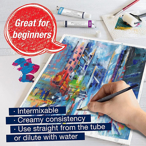 Konsistenca kremoze e bojës akrilike e bën atë një medium jashtëzakonisht të gjithanshëm për fillestarët! Gabimet mund të korrigjohen në çdo kohë kur jeni duke punuar me bojë akrilike Faber-Castell.