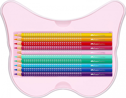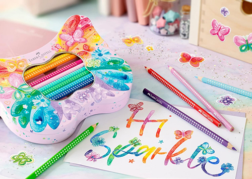 Kuti metali në formë fluture që përmban 12 lapsa me ngjyra standarde shkëlqyese dhe 8 ngjyra pastel.