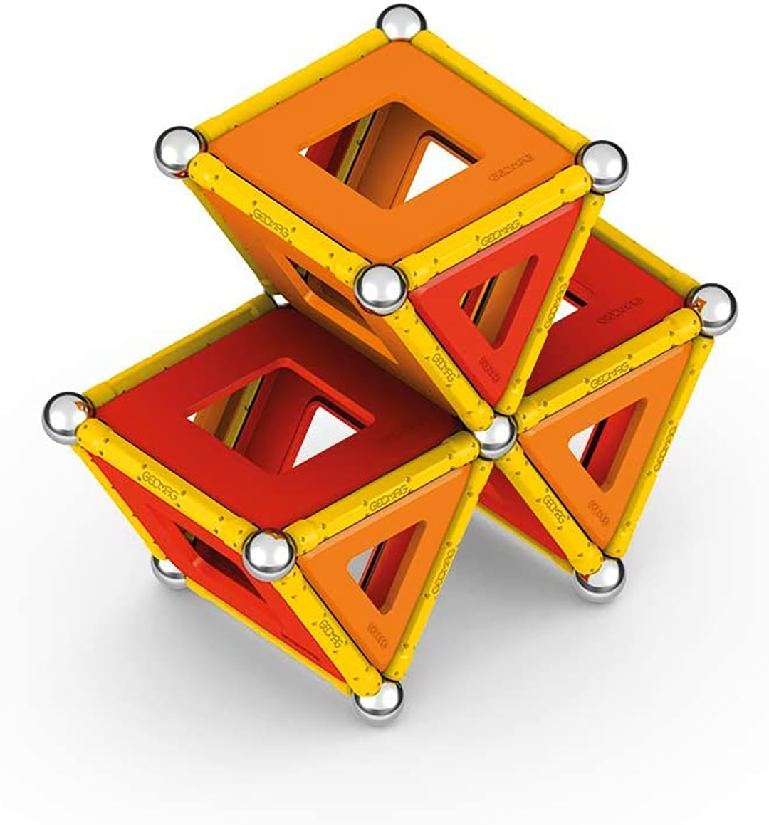 Lëreni të lirë imagjinatën tuaj: Seti gjeomagnetik përmban 20 topa metalikë (jo magnetikë), 28 shufra magnetike të verdha, 16 panele trekëndore të kuqe dhe portokalli, 12 panele katrore të kuqe dhe portokalli dhe 2 panele pesëkëndëshe portokalli.